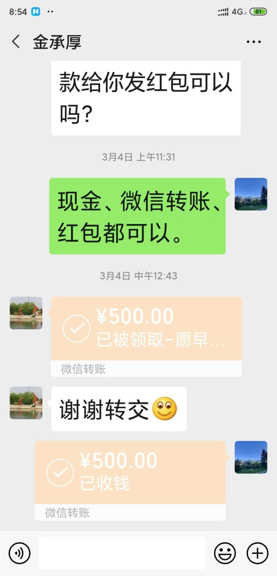 疫情面前,爱心潮涌。近日,图们市税务局党委发出全局党员干部为疫情捐款的号召后,离休30多年的图们市税务局老干部金承厚通过女儿微信转账,将500元的爱心捐助款交到了组织手中。同时,他的爱人通过社区也为抗击疫情捐款500元。